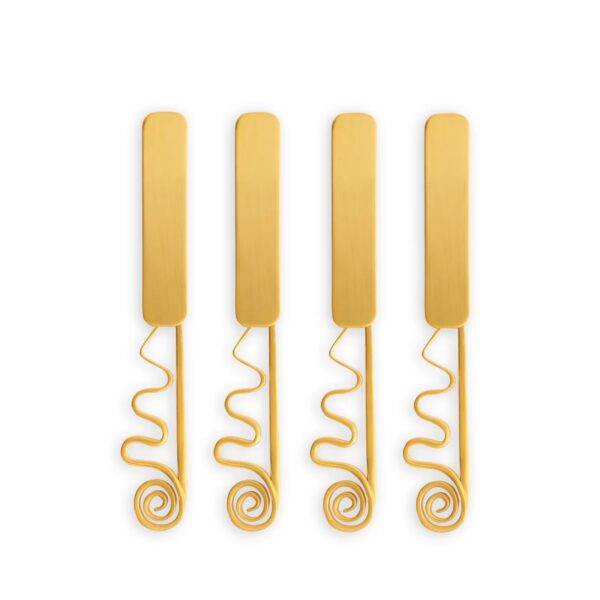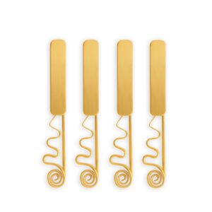 De Spirale botermesjes, ontworpen in samenwerking met de Portugese juwelier en concept artist Sebastião Lobo, brengt een vleugje surrealistische elegantie naar uw tafel. De gedraaide, spiraalvormige handgrepen zijn geïnspireerd op het werk van Alexander Calder. Messing afgewerkt met L’OBJET’s kenmerkende 24-karaats gouden plating. Deze set van 4 botermesjes is zowel sculpturaal als functioneel en transformeert elk diner of borrel in een voortreffelijke ervaring. Een waar feestje!