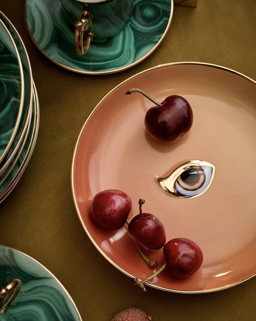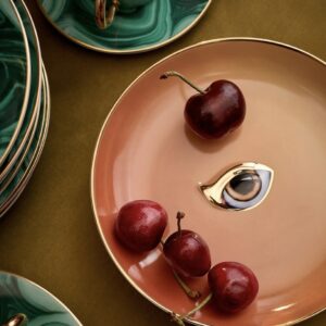 De Lito-borden, een speelse combinatie van vakmanschap en surrealistisch design zijn handgemaakt van fijn porselein en rijkelijk versierd met 24-karaats goud. Elk bord is voorzien van het kenmerkende oogmotief van de L’objet collectie en zorgvuldig ingelegd met harsdetails die de visuele impact versterken.