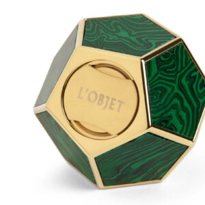 Dit peper&zout stel is handgemaakt met minutieuze aandacht voor detail, met pentagon-facetten en vergulde messing details. Deze set is volledig versierd met malachiet, een gevierd klassiek patroon en materiaal van het merk L’Objet.