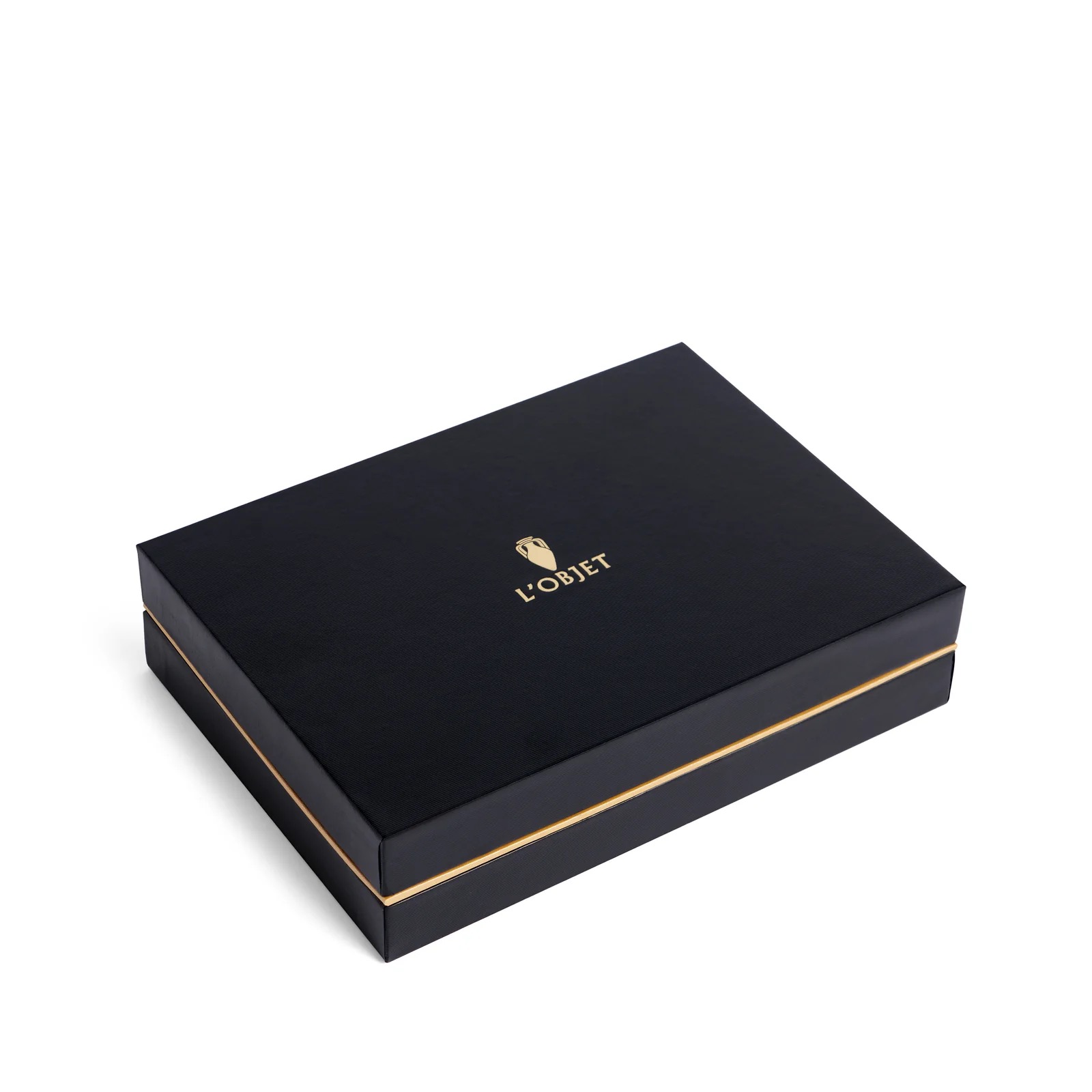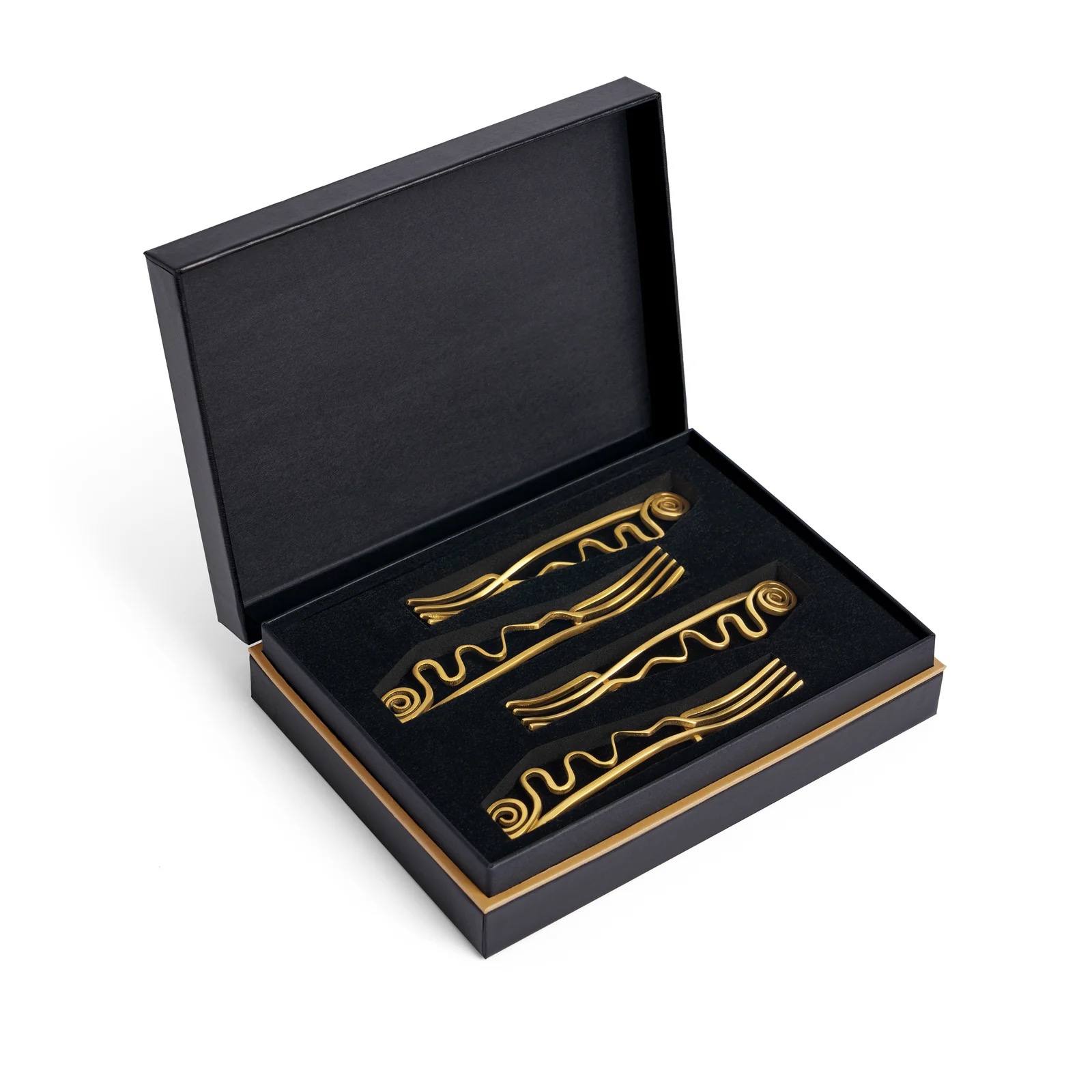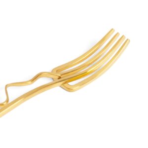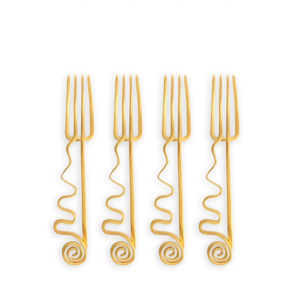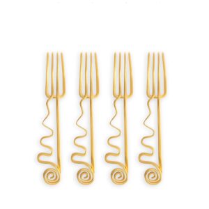 De Spirale vorkjes, ontworpen in samenwerking met de Portugese juwelier en concept artist Sebastião Lobo, brengt een vleugje surrealistische elegantie naar uw tafel. De gedraaide, spiraalvormige handgrepen zijn geïnspireerd op het werk van Alexander Calder. Messing afgewerkt met L’OBJET’s kenmerkende 24-karaats gouden plating. Deze set van 4 vorkjes is zowel sculpturaal als functioneel en transformeert elke verjaardagstaart of borrel in een voortreffelijke ervaring. Een waar feestje!